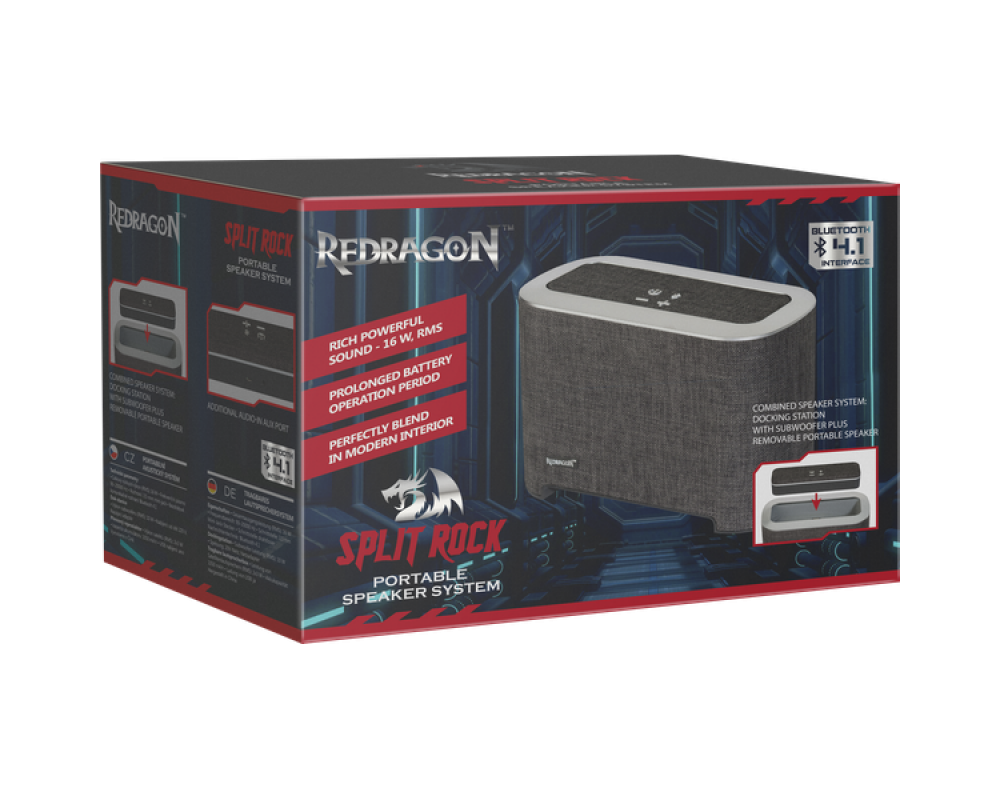 Redragon Split Rock - компактная и довольно мощная 16 Вт составная портативная акустическая сплит-система с насыщенным звучанием(стационарная база-сабвуфер + съемная портативная колонка). Уникальный дизайн системы хорошо впишется в любой современный интерьер. Она оснащена встроенным аккумулятором на 1050 мАч. Имеется AUX-вход и кабель 3,5-мм (3,5мм mini jack идет в комплекте), т.е. систему можно подключить к компьютеру, мобильному телефону, планшету и использовать как динамик. Резиновые ножки колонки Redragon Split Rock предотвращают скольжение по любой поверхности.